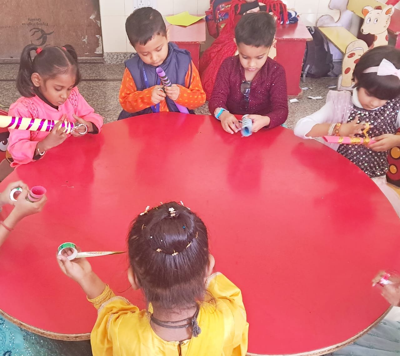 Children of class Nursery, L.K.G. and U.K.G. made Ravana face and Dandiya as an activity and bought party tiffin and watched a short Dussehra movie and celebrated the day and enjoyed a lot.